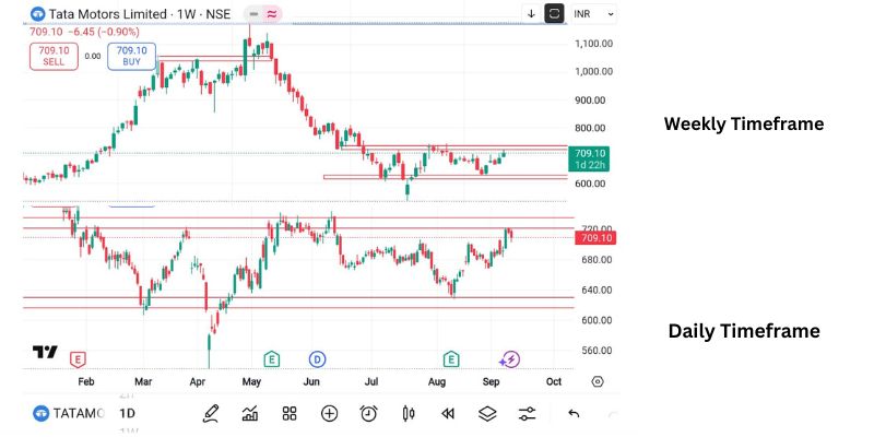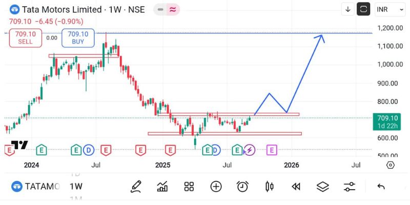 👉 Insight: The weekly chart shows a W-pattern, a bullish signal. If confirmed with volumes, Tata Motors share price could climb back to ₹900 levels.